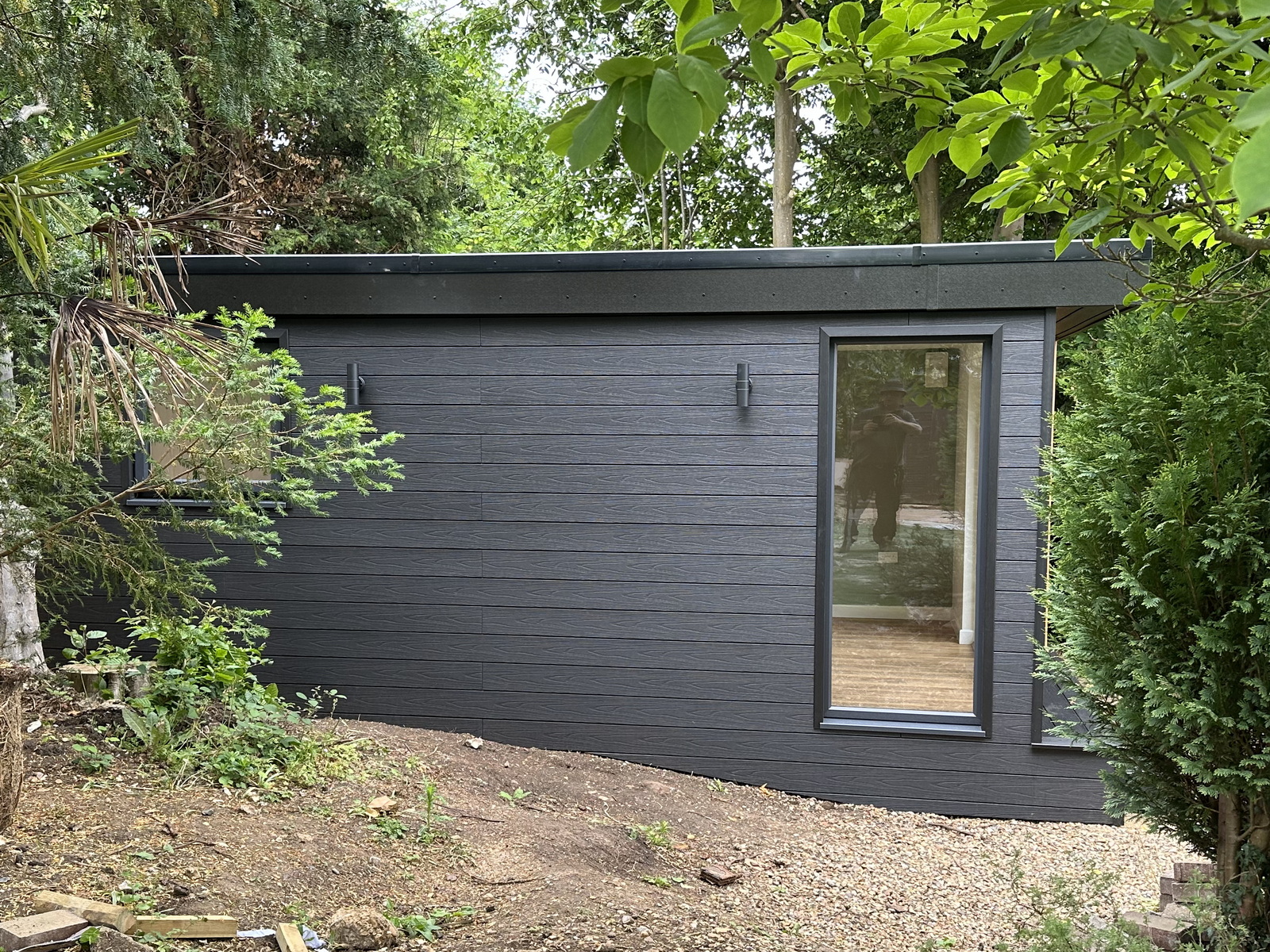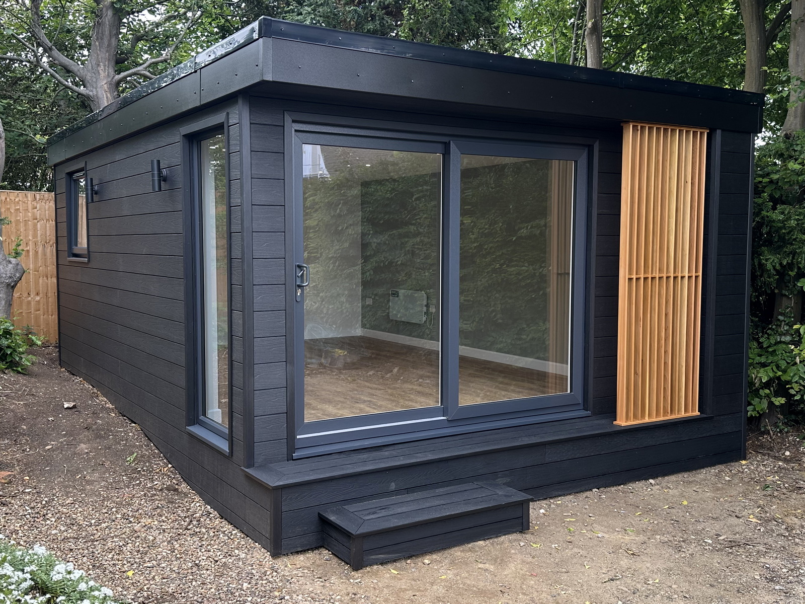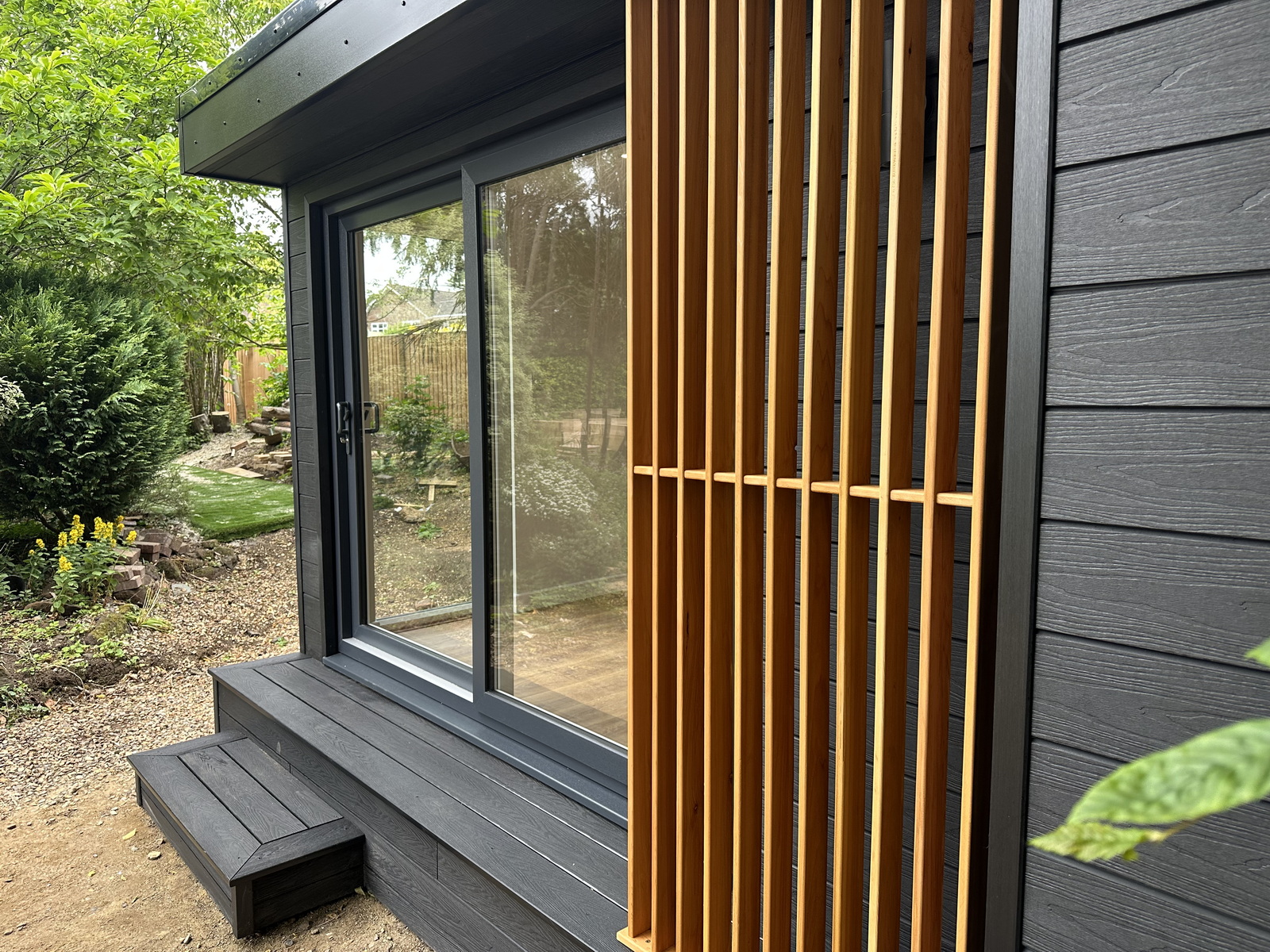 The cladding is charcoal composite for its zero maintenance and long lasting functionality but to add a little extra to the design we built a small deck and step because of the garden’s slope and added a cedar screen.